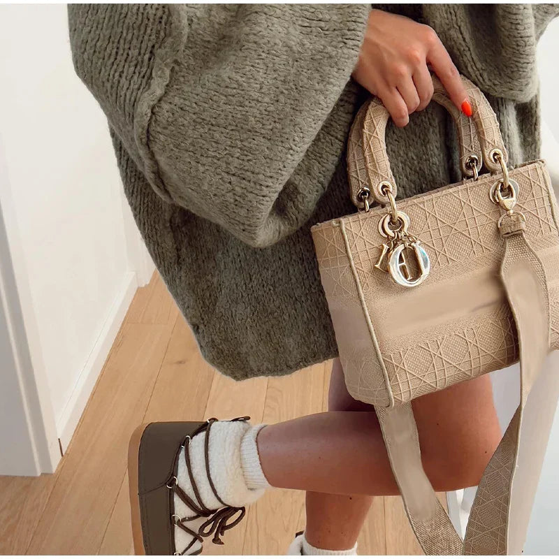- Ribbed neckline: The neckline has a ribbed texture that contrasts with the main knit body.